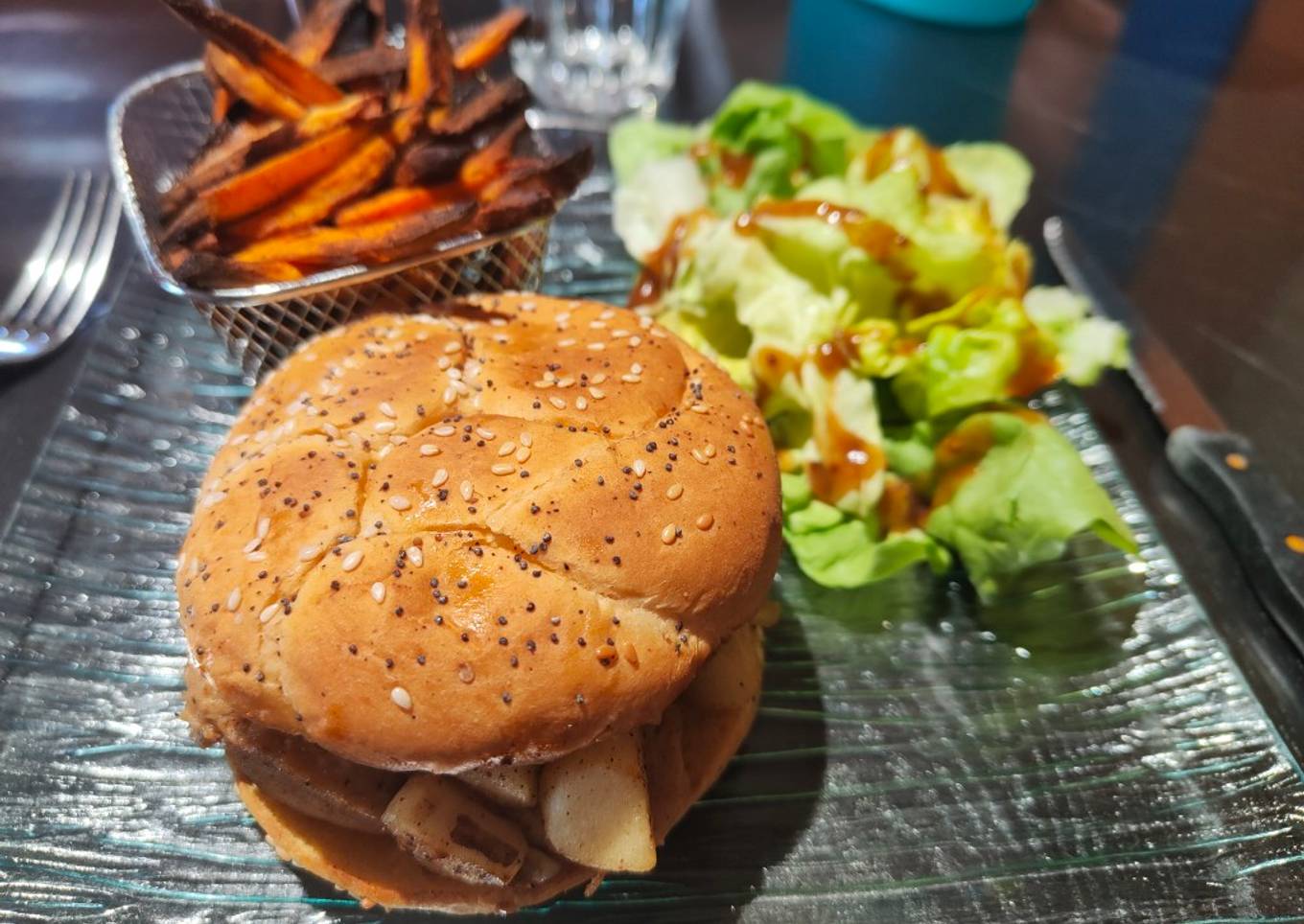 Burger boudins blancs pommes, frites de patates douces